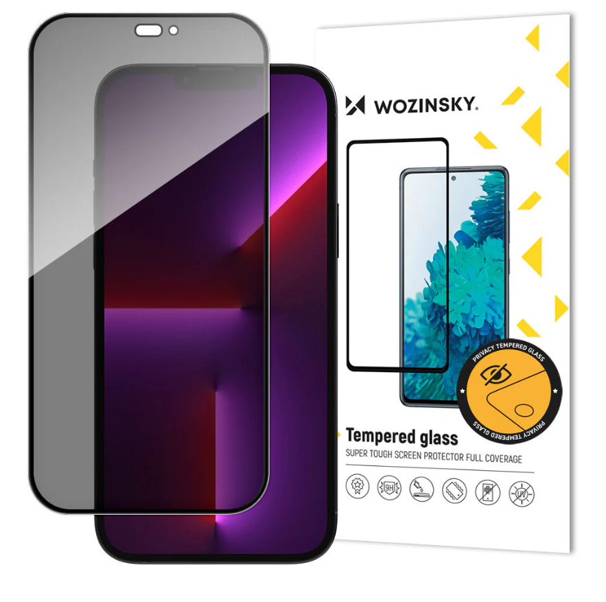 Prywatyzujące szkło hartowane Samsung Galaxy iPhone 15 z serii Wozinsky Privacy Glass z filtrem Anti Spy i czarną ramką